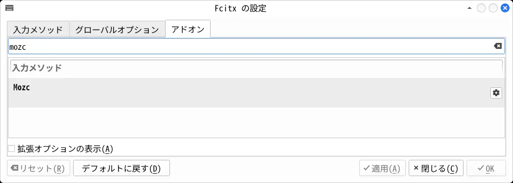 「アドオン」タブを開き、検索欄に「mozc」と入力。