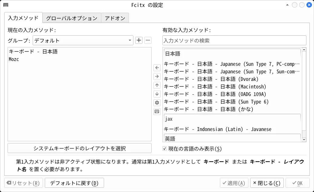左側の「現在の入力メソッド」に Mozc があるのを確認する。