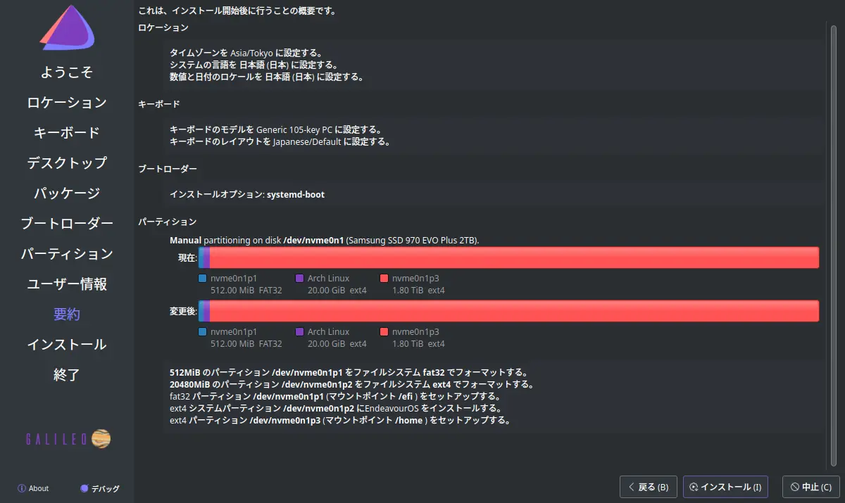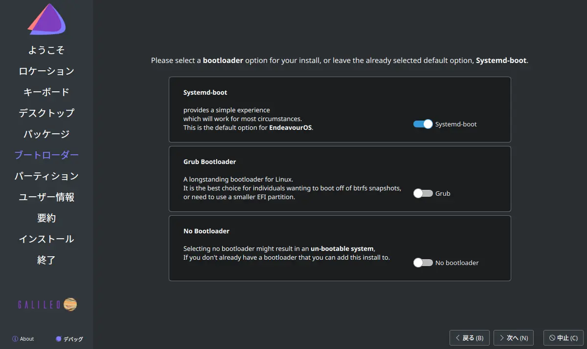 ブートローダーを選択。デフォルトは systemd-boot 。