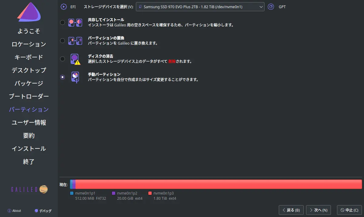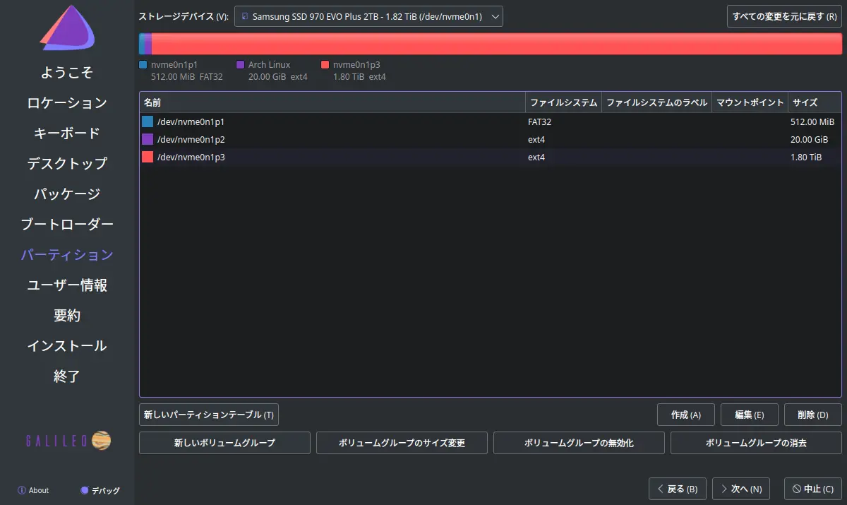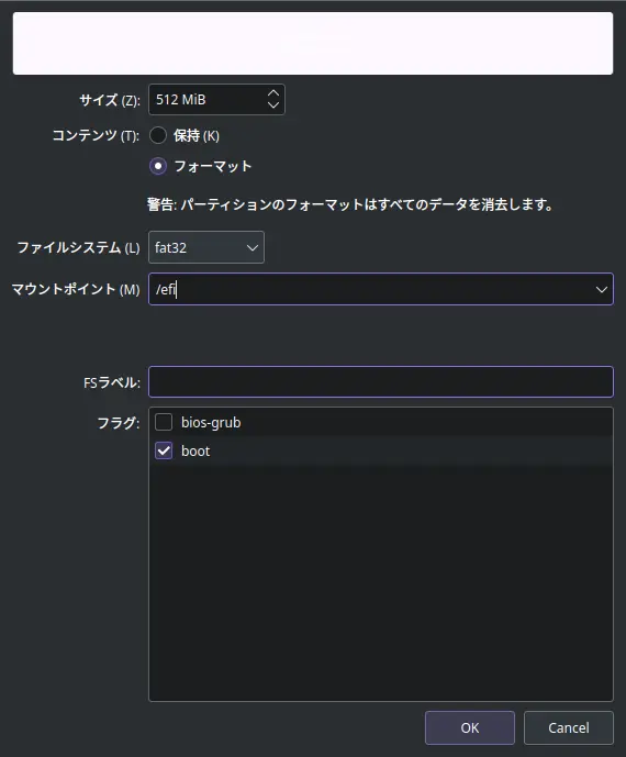 | パーティション | サイズ | フォーマット | ファイルシステム | フラグ |