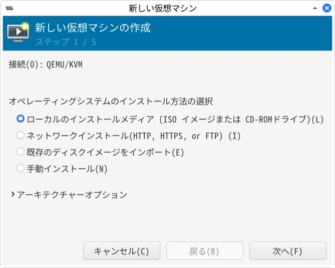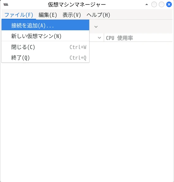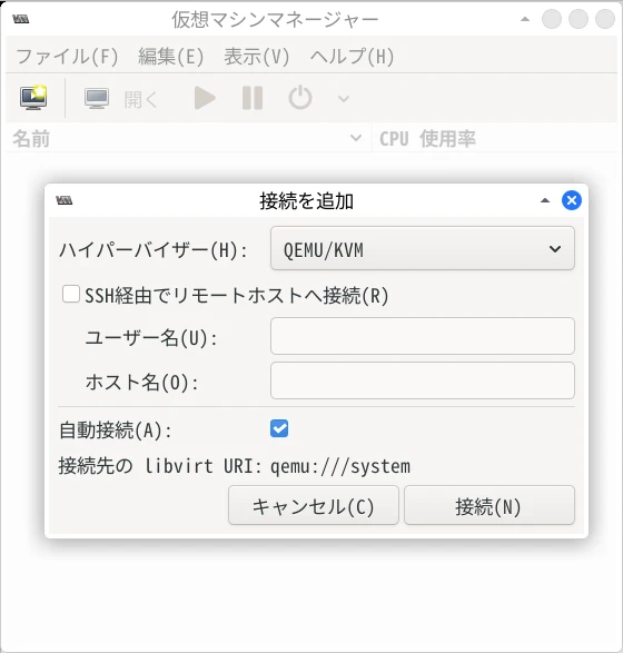 「QEMU/KVM」を選択し、「接続」をクリック