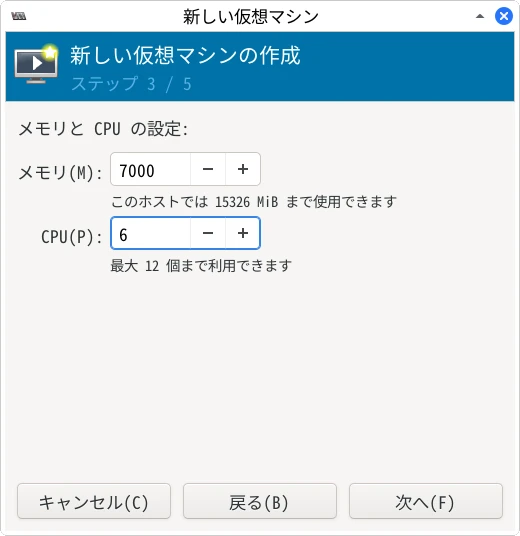 メモリの使用量とCPUの個数を設定