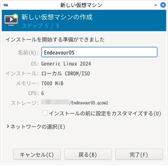 virt-manager の「EndeavourOS」を右クリックして「削除」を選択。